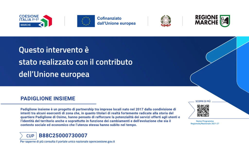 Padiglione insieme è un progetto di partnership tra imprese locali nato nel 2017 dalla condivisione di intenti tra alcuni esercenti di zona come Rossano Stura (Stura Srl) e Massimo Tavoloni (T-BROSERVICE SAS Di Tavoloni Massimo &C) che, in quanto titolari di realtà fortemente radicate alla storia del quartiere Padiglione di Osimo, hanno pensato di rafforzare la potenzialità dei servizi offerti agli utenti e l’identità del territorio anche e soprattutto in funzione dei cambiamenti e dell’evoluzione che sia il contesto sociale ed economico che l’utenza stessa hanno subìto nel tempo.